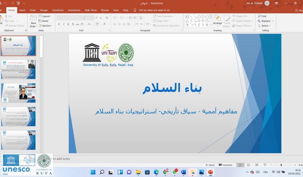 The UNESCO Chair of Dialogue at Kufa University cooperating with the Philosophy Department of the Faculty of Art at Kufa University s   organized a symposium about  “Building Peace, Renouncing Extremism and Terrorism” on Wednesday evening, 19/1/2022, in the presence of  (Dr. Alaa Shatnan )The Director of the UNESCO Chair for Dialogue and (Dr.Ahlam Majliy, Dr.Rayid Eubays, Mr. Faris Hrram ) From the philosophy department of the Faculty of Arts at Kufa University.