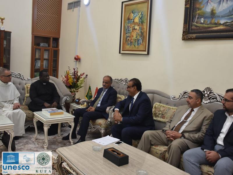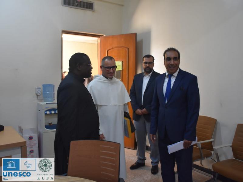 The Papal delegation visited the UNESCO Chair for Dialogue at the University of Kufa on Tuesday, October 18, 2022. During his visit to the chair, the delegation was received by Dr. Alaa Shatnan, the Director of the UNESCO Chair for Dialogue. Charles Onka Sona, Secretary of the Papal Ambassador at the Papal Embassy, and Father Dr. Dominican Emir Jaji, Member of the Pontifical Council for Interfaith Dialogue at the Vatican and Assistant Chancellor of the Dominican International University for International Relations, were in the delegation.