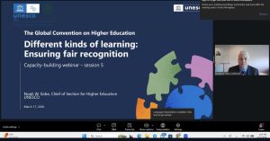 الثلاثاء 17 مارس 2026، وذلك ضمن سلسلة ندوات بناء القدرات المخصصة لدعم تنفيذ الاتفاقية العالمية للاعتراف بالمؤهلات المتعلقة بالتعليم العالي. تهدف هذه الفعالية، التي أدارها نوح و. سوبي Noah W. Sobe بمشاركة خبراء من أستراليا وأوغندا وجامايكا، إلى توضيح الفوارق بين أنماط التعلم الرسمي وغير الرسمي وغير التقليدي وكيفية تقييمها بشكل منصف وشفاف. وتأتي هذه الخطوة استجابةً للتحديات التي تفرضها زيادة حركة انتقال الطلاب وظهور مسارات تعليمية متنوعة، حيث تسعى اليونسكو من خلال المبادئ التوجيهية للاتفاقية العالمية إلى توفير إطار عمل مشترك يدعم مقيمي المؤهلات ومسؤولي القبول في عملهم اليومي لضمان حق الأفراد في الاعتراف بمؤهلاتهم الأكاديمية ما لم توجد اختلافات جوهرية.